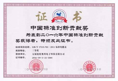 我公司作為國(guó)家標(biāo)準(zhǔn)《GB/T17215.701標(biāo)準(zhǔn)電能表》的主要起草單位獲得了2016年中國(guó)標(biāo)準(zhǔn)創(chuàng)新貢獻(xiàn)獎(jiǎng)。
