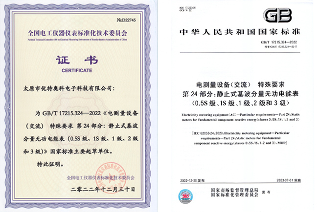 優(yōu)特奧科作為主要起草單位的國家標(biāo)準(zhǔn)《GB/T17215.324-2022電測量設(shè)備(交流)特殊要求 第24部分:靜止式基波分量無功電能表(0.5S級、1S級、1級、2級和3級)》于2022年12月30日發(fā)布,2023年7月1日實(shí)施。