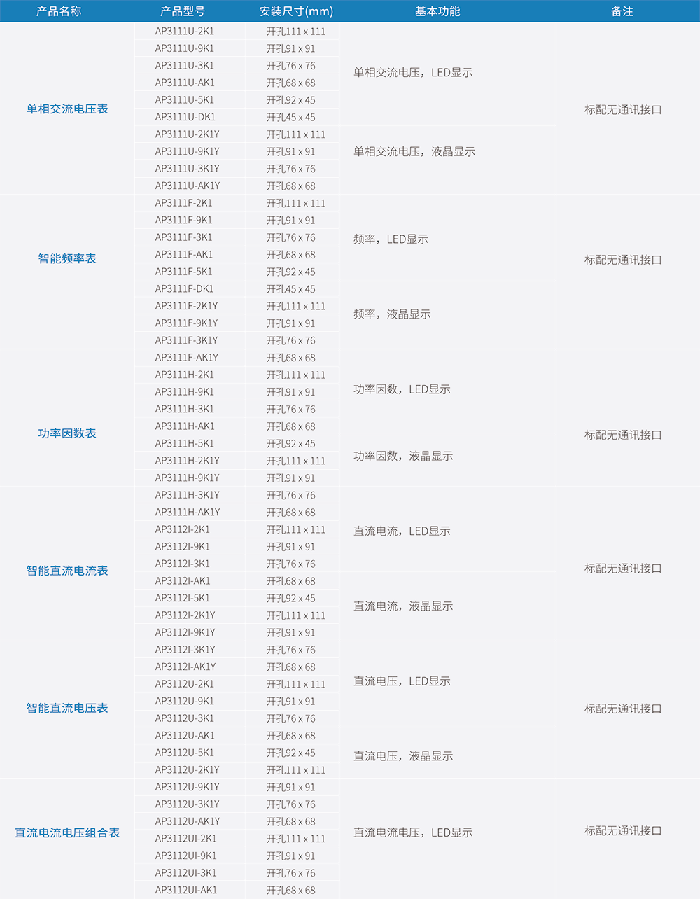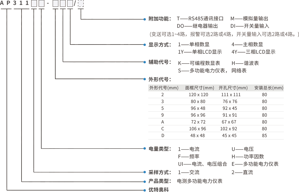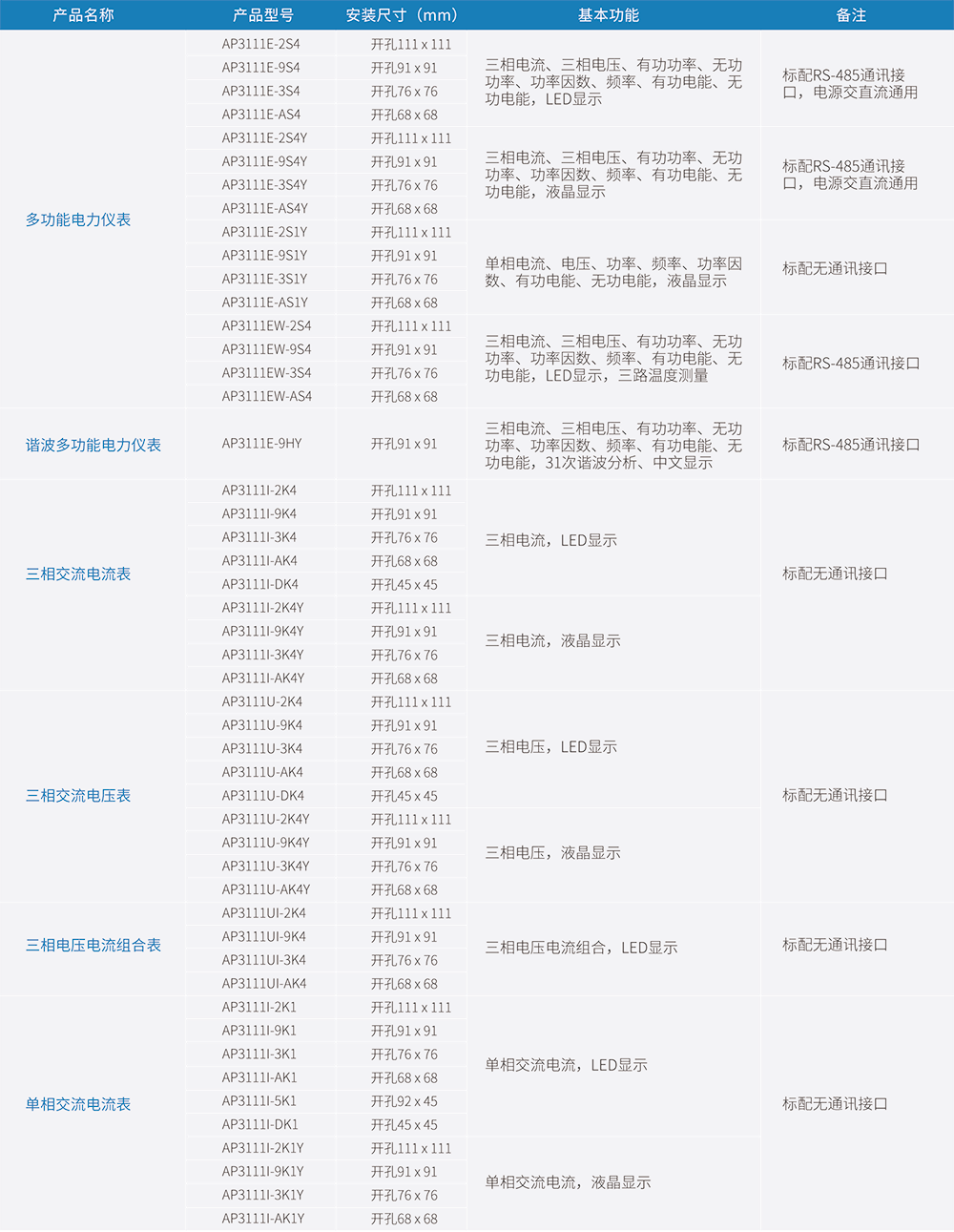 AP311系列多功能電力儀表為新一代可編程、經(jīng)濟(jì)型、安裝式多功能電力儀表,該系列儀表采用SMT生產(chǎn)工藝、交流采樣、真有效值( RMS )測量方式,具有RS-485數(shù)字接口,采用MODBUS-RTU通訊規(guī)約。該系列儀表種類齊全,可單獨(dú)或組合實(shí)現(xiàn)三相電流、三相電壓、單相電流、單相電壓、有功功率、無功功率、功率因數(shù)、頻率、有功電能、無功電能等數(shù)據(jù)的顯示、采集及傳輸;各類產(chǎn)品均提供LED顯示和液晶顯示兩種選擇。廣泛用于工業(yè)、商業(yè)、民用電力系統(tǒng)和變電站中。