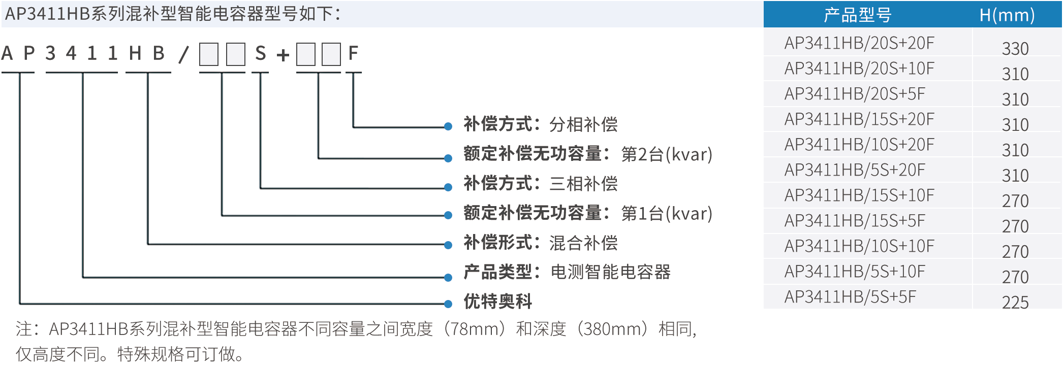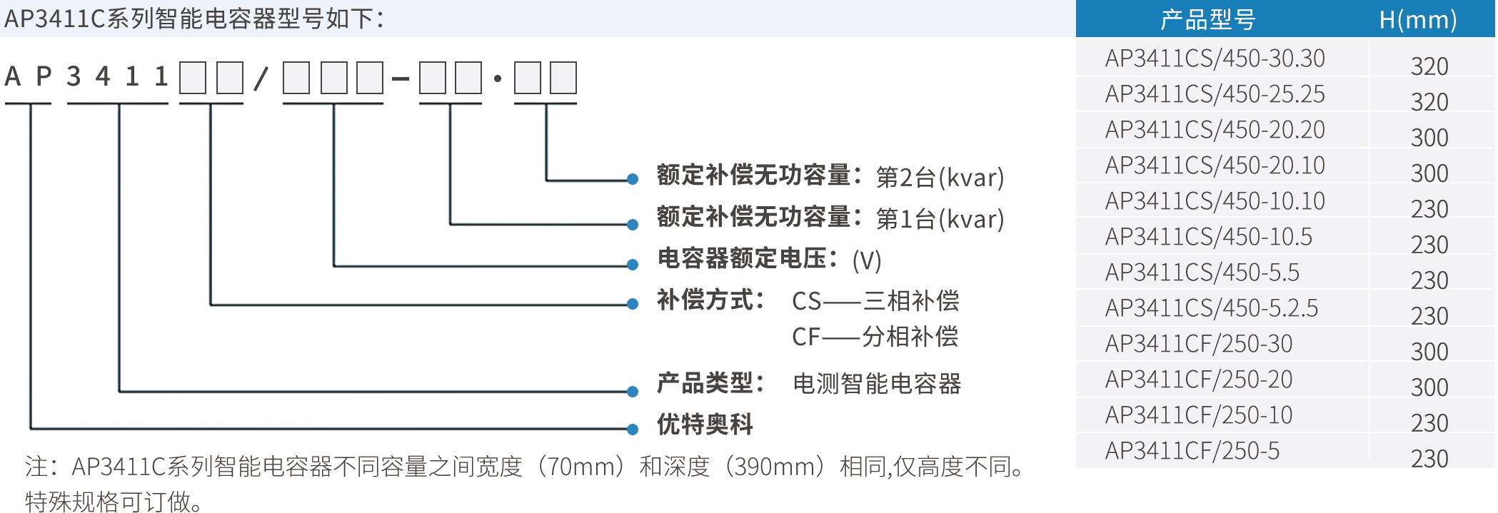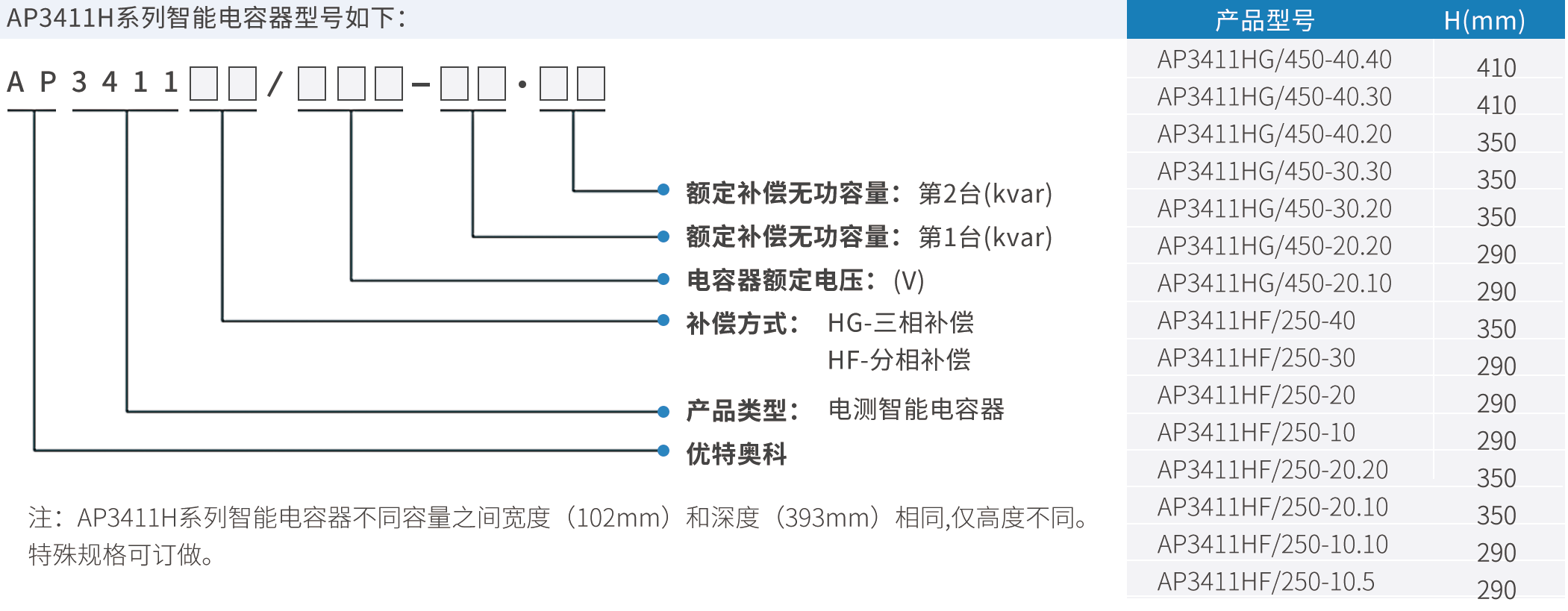 AP3411C系列智能電容器是由智能測(cè)控單元、同步零投切開(kāi)關(guān)、智能保護(hù)單元、組網(wǎng)單元、顯示單元、兩臺(tái)(△型)或一臺(tái)(Y型)低壓自愈式電力電容器組成一個(gè)獨(dú)立完整的智能無(wú)功補(bǔ)償系統(tǒng)。產(chǎn)品既可單臺(tái)使用,也可多臺(tái)組網(wǎng)構(gòu)成補(bǔ)償系統(tǒng)使用;既可配套AP系列低壓無(wú)功綜合測(cè)控儀使用,也可使用二次電流互感器直接構(gòu)成補(bǔ)償系統(tǒng)使用;既可三相補(bǔ)償,也可三相和分相混合補(bǔ)償。AP3411C系列智能電容器應(yīng)用于電網(wǎng)諧波含量較低的低壓電力系統(tǒng)中,可靠運(yùn)行,提高系統(tǒng)功率因數(shù),降低線損,提高電網(wǎng)電能質(zhì)量。 AP3411H系列智能電容器,除具備AP411C系列產(chǎn)品的所有功能外,還可以實(shí)現(xiàn)更大補(bǔ)償容量(40+40)Kvar,更大分?jǐn)嗄芰Γú捎盟軞嗦菲鳎㊣cu≥20KA。 AP3411HB系列混補(bǔ)型智能電容器是由智能測(cè)控單元、零投切開(kāi)關(guān)、智能保護(hù)單元、一臺(tái)(△型)和一臺(tái)(Y型)低壓自愈式電力電容器組成一個(gè)獨(dú)立完整的智能補(bǔ)償單元,替代由智能無(wú)功控制器、熔絲(或微斷)、晶閘管復(fù)合開(kāi)關(guān)(或接觸器)、熱繼電器、低壓電力電容器多種分散器件組裝而成的自動(dòng)無(wú)功補(bǔ)償裝置。